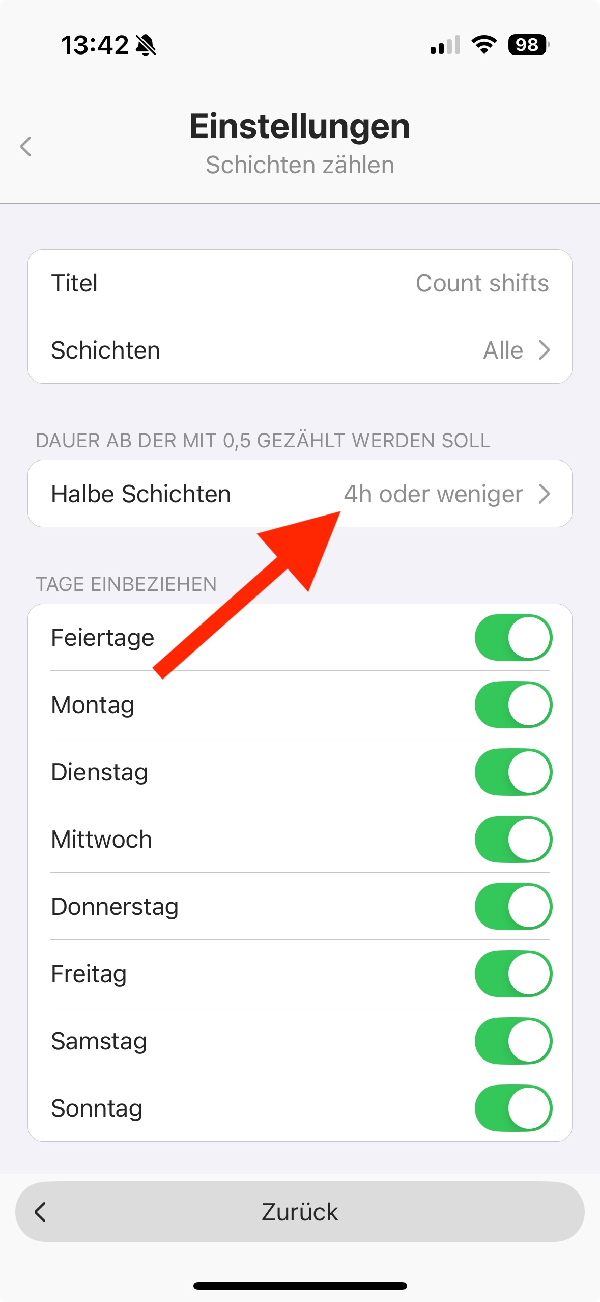 Wenn du bei der Schichten-Zählen Auswertung halbe Urlaubstage zählen möchtest, dann kannst du eine Schicht mit der hälfte der regulären Arbeitszeit (z.B. 4 Stunden) eintragen, statt ganztägig.